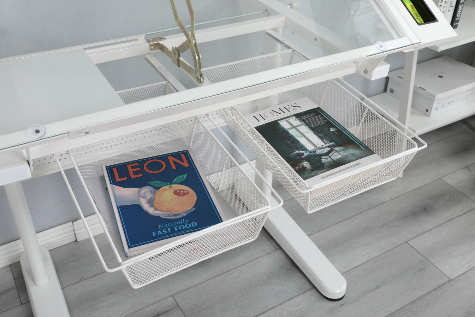 Home > Hand Crank Adjustable Drafting Table Drawing Desk With 2 Metal Drawers WhiteWITH STOOL